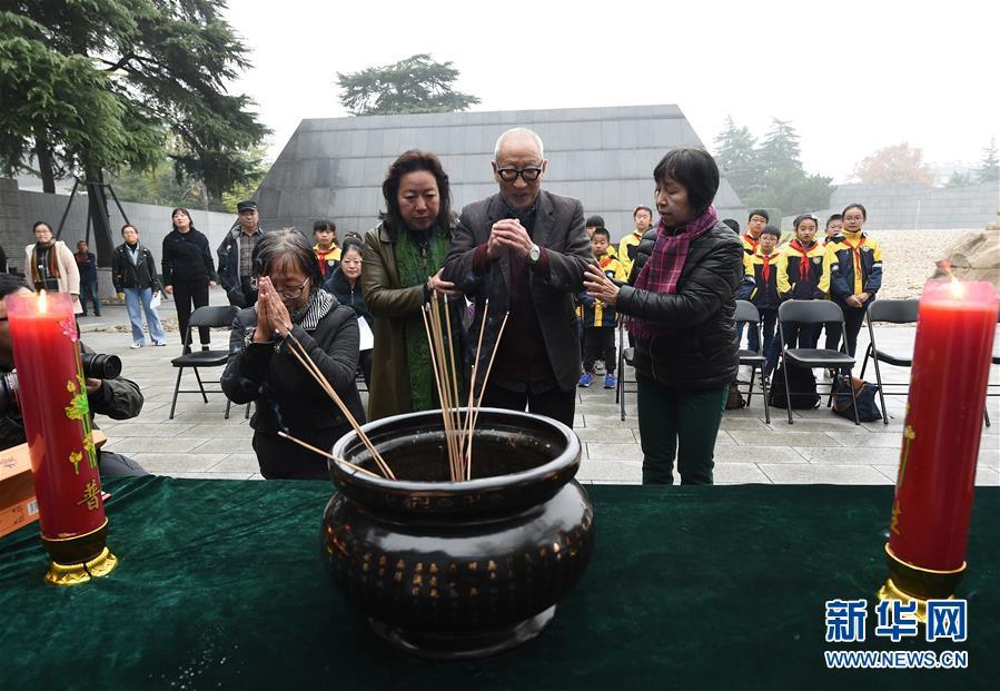 12月3日,南京大屠殺幸存者石秀英焚香祭奠被侵華日軍殺害的親人。 當日,在第五個南京大屠殺死難者國家公祭日到來之際,南京大屠殺死難者遺屬家祭活動在侵華日軍南京大屠殺遇難同胞紀念館正式啟動。首批前來開展家祭活動的南京大屠殺幸存者余昌祥、石秀英老人分別率家屬在紀念館內的死難者名單墻前獻花、敬香、跪拜,并誦讀家信,表達對親人的哀思。 新華社記者 孫參 攝