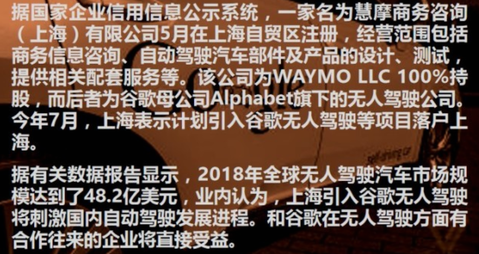 谷歌母公司Alphabet旗下研究自動(dòng)駕駛的部門Waymo在自動(dòng)駕駛領(lǐng)域處于全球領(lǐng)先水平,當(dāng)前其已經(jīng)完成800萬英里(約1287萬公里)自動(dòng)駕駛汽車公共道路測(cè)試,模擬測(cè)試?yán)锍踢_(dá)到50億英里(約80.47億公里)。Waymo計(jì)劃在為今年下半年向部分地區(qū)的美國(guó)消費(fèi)者推出無人駕駛服務(wù)。