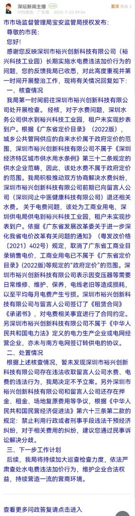 感謝您反映深圳市裕興創(chuàng)新科技有限公司(裕興科技工業(yè)園)長期實施水電費違法加價行為的問題,您的反饋我局已收悉,對此高度重視并第一時間開展整治工作,現將有關情況回復如下: