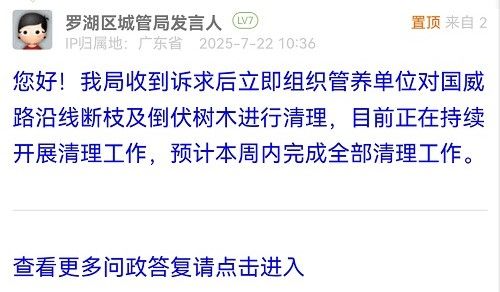 您好!我局收到訴求后立即組織管養(yǎng)單位對國威路沿線斷枝及倒伏樹木進行清理,目前正在持續(xù)開展清理工作,預計本周內完成全部清理工作。