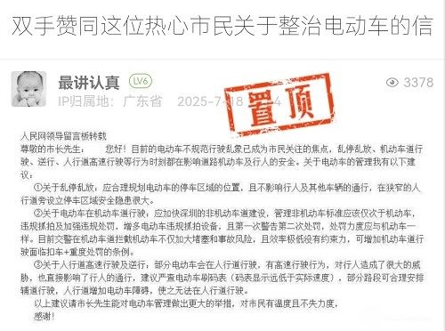 20. 帖文《雙手贊同這位熱心市民關于整治電動車的信》