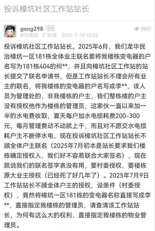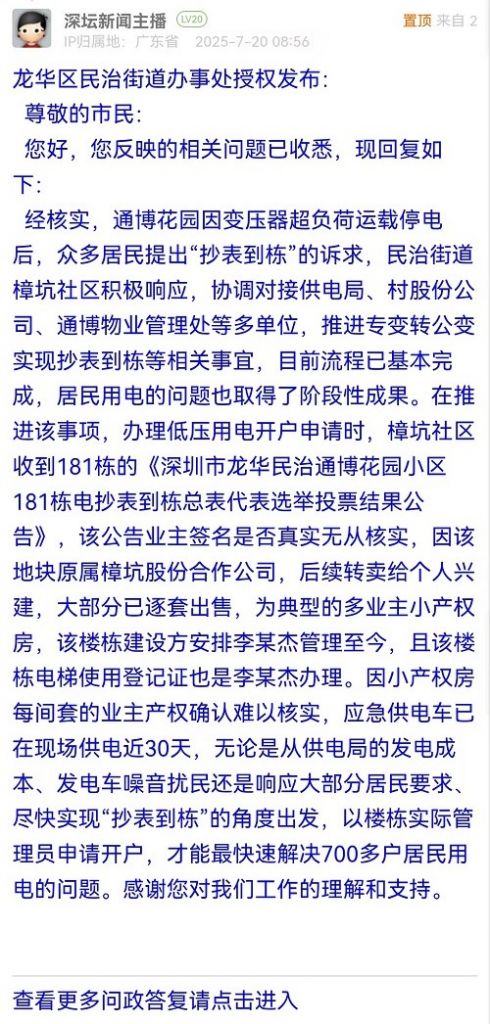經核實,通博花園因變壓器超負荷運載停電后,眾多居民提出“抄表到棟”的訴求,民治街道樟坑社區(qū)積極響應,協(xié)調對接供電局、村股份公司、通博物業(yè)管理處等多單位,推進專變轉公變實現抄表到棟等相關事宜,目前流程已基本完成,居民用電的問題也取得了階段性成果。在推進該事項,辦理低壓用電開戶申請時,樟坑社區(qū)收到181棟的《深圳市龍華民治通博花園小區(qū)181棟電抄表到棟總表代表選舉投票結果公告》,該公告業(yè)主簽名是否真實無從核實,因該地塊原屬樟坑股份合作公司,后續(xù)轉賣給個人興建,大部分已逐套出售,為典型的多業(yè)主小產權房,該樓棟建設方安排李某杰管理至今,且該樓棟電梯使用登記證也是李某杰辦理。因小產權房每間套的業(yè)主產權確認難以核實,應急供電車已在現場供電近30天,無論是從供電局的發(fā)電成本、發(fā)電車噪音擾民還是響應大部分居民要求、盡快實現“抄表到棟”的角度出發(fā),以樓棟實際管理員申請開戶,才能最快速解決700多戶居民用電的問題。感謝您對我們工作的理解和支持。