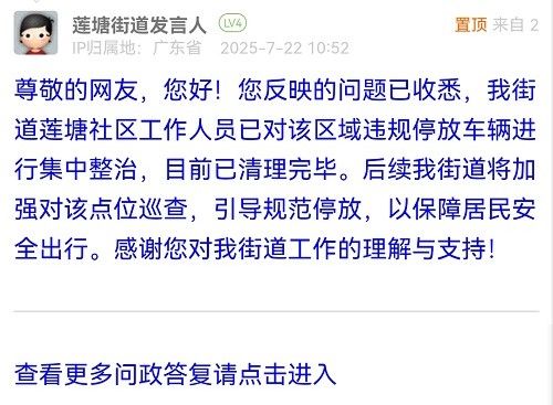 尊敬的網友,您好!您反映的問題已收悉,我街道蓮塘社區(qū)工作人員已對該區(qū)域違規(guī)停放車輛進行集中整治,目前已清理完畢。后續(xù)我街道將加強對該點位巡查,引導規(guī)范停放,以保障居民安全出行。感謝您對我街道工作的理解與支持!