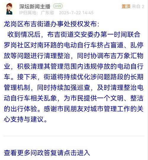 收到情況后,布吉街道交安委辦第一時間聯(lián)合羅崗社區(qū)對南環(huán)路的電動自行車擠占盲道、亂停放等問題進行清理整治,同時協(xié)調布吉萬象匯物業(yè),積極清理其管理范圍內違規(guī)停放的電動自行車。接下來,街道將持續(xù)優(yōu)化涉問題路段的長期管理機制,同時持續(xù)加強巡查,及時清理整治電動自行車相關亂象,為市民提供一個文明、整潔的出行體驗。感謝市民朋友對城市管理工作的關心支持與建議。