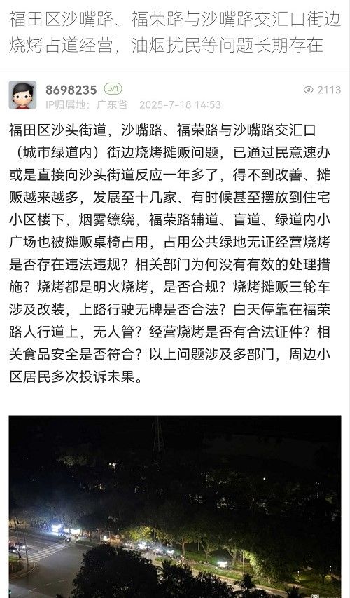22. 帖文《福田區(qū)沙嘴路、福榮路與沙嘴路交匯口街邊燒烤占道經營,油煙擾民等問題長期存在》
