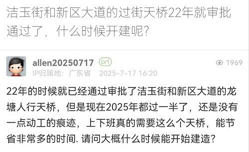 16. 帖文《潔玉街和新區(qū)大道的過街天橋22年就審批通過了,什么時候開建呢?》