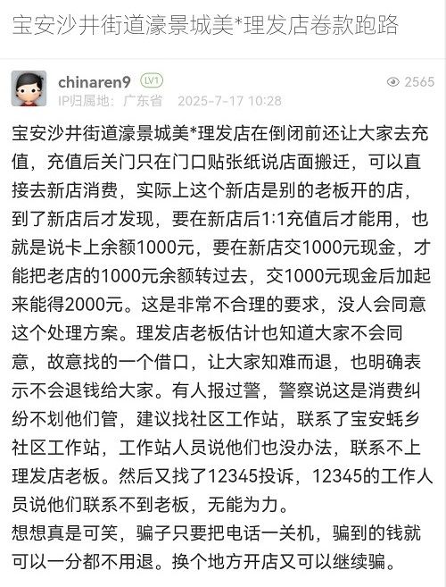 39. 帖文《寶安沙井街道濠景城美*理發(fā)店卷款跑路》