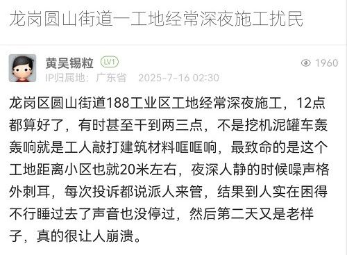 11. 帖文《龍崗圓山街道一工地經常深夜施工擾民》