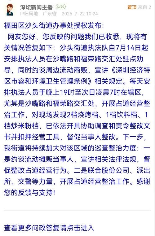 網友您好,您反映的問題我們已收悉,現將有關情況答復如下:沙頭街道執(zhí)法隊自7月14日起安排執(zhí)法人員在沙嘴路和福榮路交匯處駐點勸導,同時約談周邊流動商販,宣講《深圳經濟特區(qū)市容和環(huán)境衛(wèi)生管理條例》相關規(guī)定。每天安排執(zhí)法人員于晚上19時至次日凌晨7時在轄區(qū),尤其是沙嘴路和福榮路交匯處,開展占道經營整治工作,對現場發(fā)現2檔燒烤檔、1檔飲料檔、1檔炒米粉檔,已依法開具協(xié)助調查和責令整改文書并扣押經營工具,督促當事人整改。下一步,我街道將持續(xù)加大對該區(qū)域的巡查整治力度:一是約談流動攤販當事人,宣講相關法律法規(guī),督促整改占道經營行為。二是聯(lián)合股份公司、派出所、交警等力量,開展占道經營整治工作。感謝您的反饋與支持!
