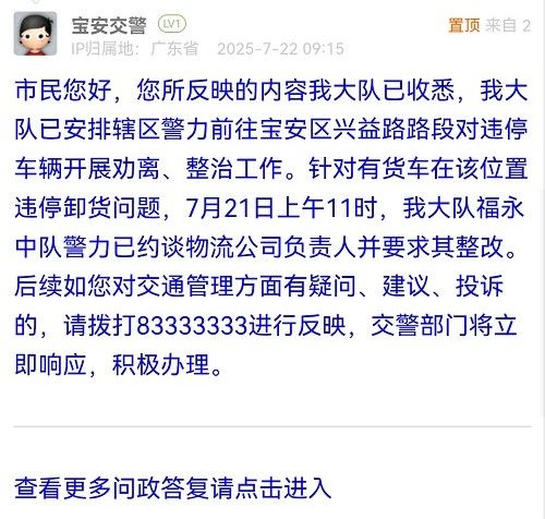 市民您好,您所反映的內容我大隊已收悉,我大隊已安排轄區(qū)警力前往寶安區(qū)興益路路段對違停車輛開展勸離、整治工作。針對有貨車在該位置違停卸貨問題,7月21日上午11時,我大隊福永中隊警力已約談物流公司負責人并要求其整改。后續(xù)如您對交通管理方面有疑問、建議、投訴的,請撥打83333333進行反映,交警部門將立即響應,積極辦理。
