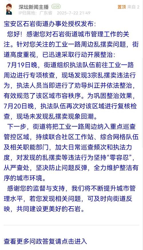 您好!感謝您對石巖街道城市管理工作的關注。針對您關注的工業(yè)一路周邊亂擺賣問題,街道高度重視,已迅速采取行動開展整治: