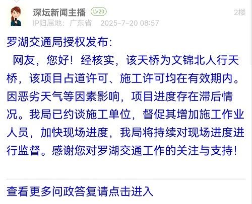 網友,您好!經核實,該天橋為文錦北人行天橋,該項目占道許可、施工許可均在有效期內。因惡劣天氣等因素影響,項目進度存在滯后情況。我局已約談施工單位,督促其增加施工作業(yè)人員,加快現場進度,我局將持續(xù)對現場進度進行監(jiān)督。感謝您對羅湖交通工作的關注與支持!