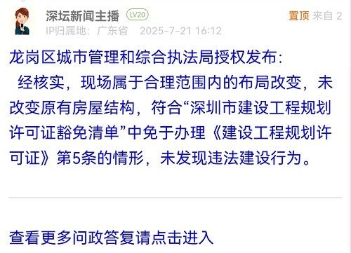 經核實,現場屬于合理范圍內的布局改變,未改變原有房屋結構,符合“深圳市建設工程規(guī)劃許可證豁免清單”中免于辦理《建設工程規(guī)劃許可證》第5條的情形,未發(fā)現違法建設行為。