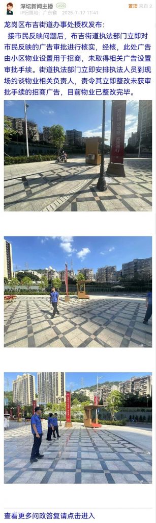 接市民反映問題后,布吉街道執(zhí)法部門立即對市民反映的廣告審批進行核實,經核,此處廣告由小區(qū)物業(yè)設置用于招商,未取得相關廣告設置審批手續(xù)。街道執(zhí)法部門立即安排執(zhí)法人員到現場約談物業(yè)相關負責人,責令其立即整改未獲審批手續(xù)的招商廣告,目前物業(yè)已整改完畢。