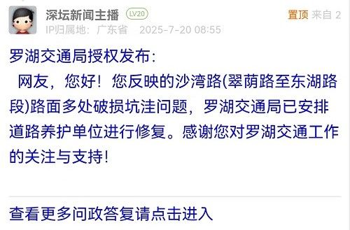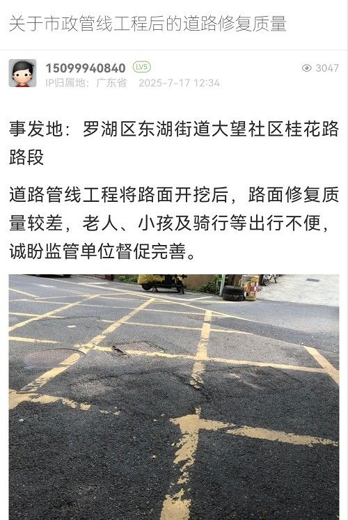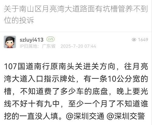 31. 帖文《關于南山區(qū)月亮灣大道路面有坑槽管養(yǎng)不到位的投訴》