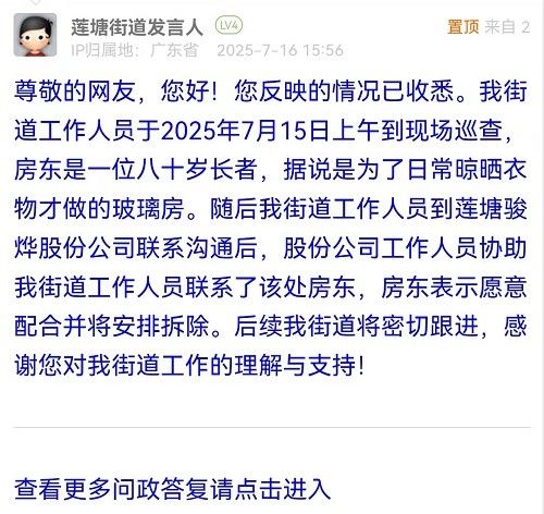 尊敬的網友,您好!您反映的情況已收悉。我街道工作人員于2025年7月15日上午到現場巡查,房東是一位八十歲長者,據說是為了日常晾曬衣物才做的玻璃房。隨后我街道工作人員到蓮塘駿燁股份公司聯(lián)系溝通后,股份公司工作人員協(xié)助我街道工作人員聯(lián)系了該處房東,房東表示愿意配合并將安排拆除。后續(xù)我街道將密切跟進,感謝您對我街道工作的理解與支持!