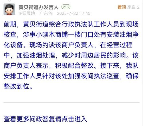 前期,黃貝街道綜合行政執(zhí)法隊工作人員到現場核查,涉事小嘿木商鋪一樓門口處有安裝油煙凈化設備。現場約談該商戶負責人,在經營過程中,加強油煙處理,減少對周邊居民的影響。該商戶負責人表示,積極配合整改。接下來,我隊安排工作人員針對該處加強夜間執(zhí)法巡查,確保整改到位。