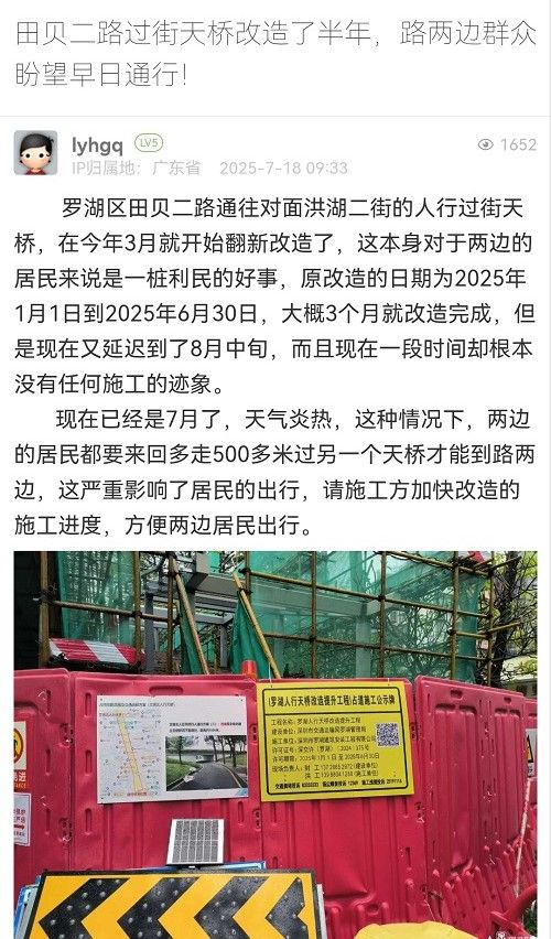 19. 帖文《田貝二路過街天橋改造了半年,路兩邊群眾盼望早日通行!》