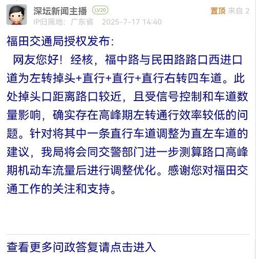 網友您好!經核,福中路與民田路路口西進口道為左轉掉頭+直行+直行+直行右轉四車道。此處掉頭口距離路口較近,且受信號控制和車道數量影響,確實存在高峰期左轉通行效率較低的問題。針對將其中一條直行車道調整為直左車道的建議,我局將會同交警部門進一步測算路口高峰期機動車流量后進行調整優(yōu)化。感謝您對福田交通工作的關注和支持。