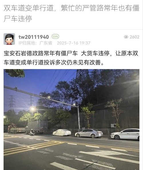 38. 帖文《雙車道變單行道,繁忙的嚴管路常年也有僵尸車違停》