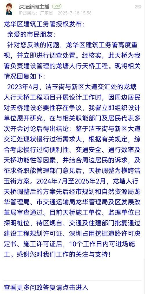 2023年4月,潔玉街與新區(qū)大道交匯處的龍?zhí)寥诵刑鞓蚬こ添椖块_展設計工作時,因周邊居民對天橋建設必要性存在爭議,我署立即組織設計單位展開研究,在與相關職能部門及居民代表多次開會討論后得出結論:鑒于潔玉街與新區(qū)大道交匯處現狀慢行過街需求大,根據有關規(guī)定,綜合考慮慢行過街便利性、交通安全、通行效率及天橋功能性等因素,并結合周邊居民的訴求,及征求各職能管理部門意見后,天橋調整為橫跨潔玉街方案。2024年7月至2025年2月,龍?zhí)寥诵刑鞓蛘{整后的方案先后經市規(guī)劃和自然資源局龍華管理局、市交通運輸局龍華管理局及區(qū)發(fā)展改革局審查通過。目前天橋施工單位、監(jiān)理單位已探明樁位,待區(qū)規(guī)自、交通及住建部門批復通過建設工程規(guī)劃許可證、深圳占用挖掘道路許可決定書、施工許可證后,10個工作日內可進場施工。感謝您對我們工作的關注與支持!