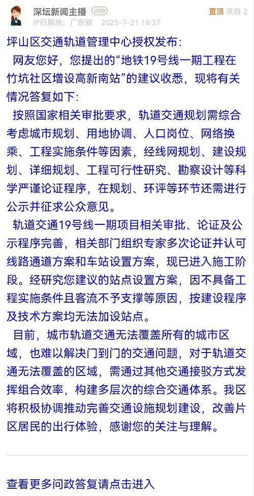 網友您好,您提出的“地鐵19號線一期工程在竹坑社區(qū)增設高新南站”的建議收悉,現將有關情況答復如下: