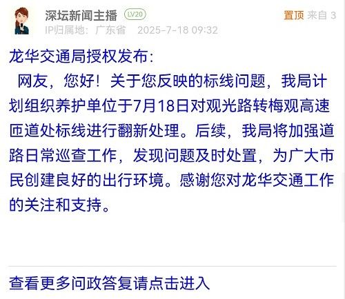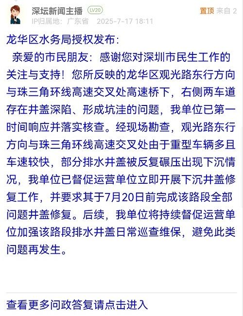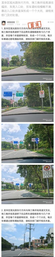 15. 帖文《龍華區(qū)觀光路東行方向,珠三角環(huán)線高速往福田、東莞入口處,雙車道標線模糊不清,靠近入口處井蓋深形成一個個大坑,請相關部門及時處理。》
