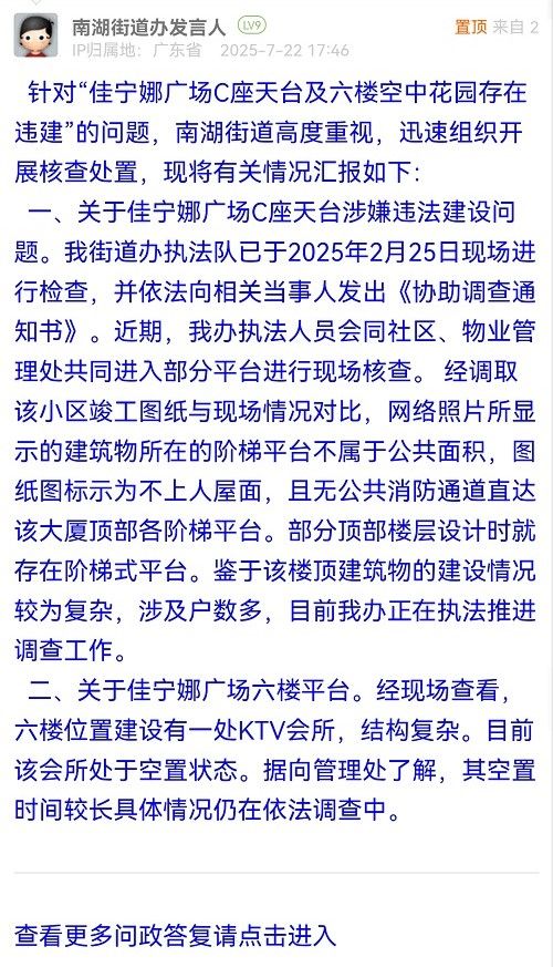 針對“佳寧娜廣場C座天臺及六樓空中花園存在違建”的問題,南湖街道高度重視,迅速組織開展核查處置,現將有關情況匯報如下: