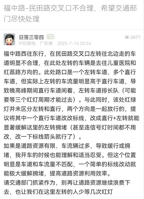 6. 帖文《福中路-民田路交叉口不合理,希望交通部門盡快處理》