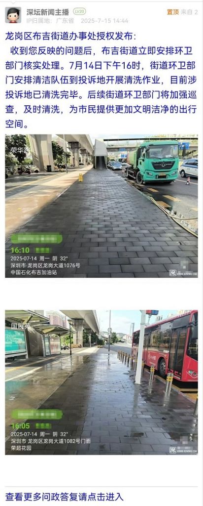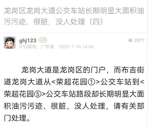3. 帖文《龍崗區(qū)龍崗大道公交車站長期明顯大面積油污污跡、很臟,沒人處理(四)》