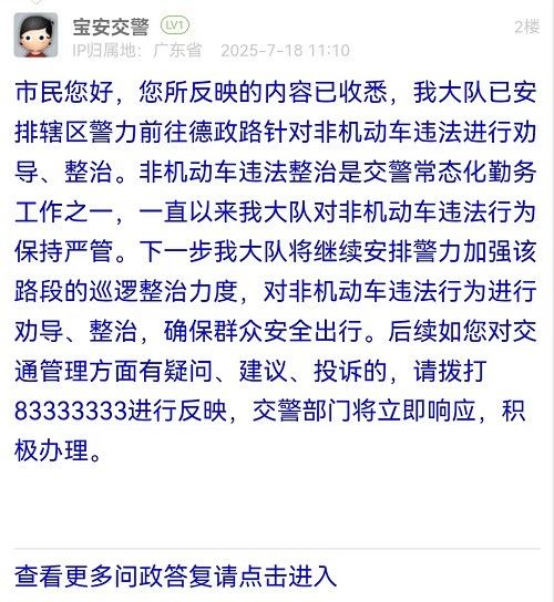 市民您好,您所反映的內容已收悉,我大隊已安排轄區(qū)警力前往德政路針對非機動車違法進行勸導、整治。非機動車違法整治是交警常態(tài)化勤務工作之一,一直以來我大隊對非機動車違法行為保持嚴管。下一步我大隊將繼續(xù)安排警力加強該路段的巡邏整治力度,對非機動車違法行為進行勸導、整治,確保群眾安全出行。后續(xù)如您對交通管理方面有疑問、建議、投訴的,請撥打83333333進行反映,交警部門將立即響應,積極辦理。