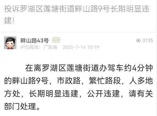 1. 帖文《投訴羅湖區(qū)蓮塘街道畔山路9號長期明顯違建!》