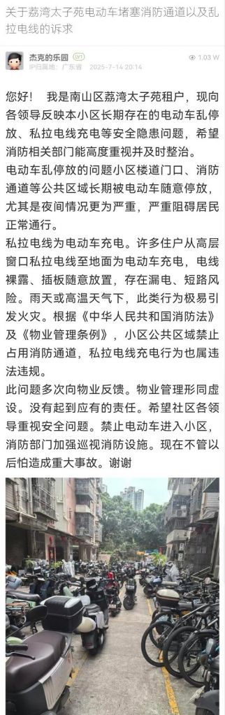 5. 帖文《關于荔灣太子苑電動車堵塞消防通道以及亂拉電線的訴求》