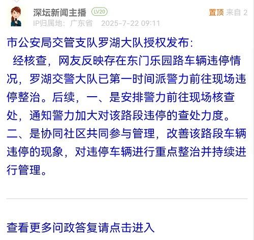 經核查,網友反映存在東門樂園路車輛違停情況,羅湖交警大隊已第一時間派警力前往現場違停整治。后續(xù),一、是安排警力前往現場核查處,通知警力加大對該路段違停的查處力度。二、是協(xié)同社區(qū)共同參與管理,改善該路段車輛違停的現象,對違停車輛進行重點整治并持續(xù)進行管理。