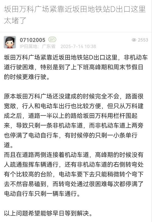 2. 帖文《坂田萬科廣場緊靠近坂田地鐵站D出口這里太堵了》