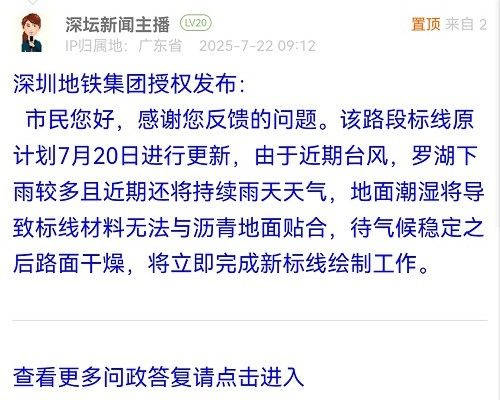 市民您好,感謝您反饋的問題。該路段標線原計劃7月20日進行更新,由于近期臺風,羅湖下雨較多且近期還將持續(xù)雨天天氣,地面潮濕將導致標線材料無法與瀝青地面貼合,待氣候穩(wěn)定之后路面干燥,將立即完成新標線繪制工作。