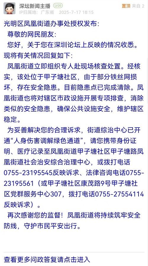 鳳凰街道立即組織專人赴現場核查處置。經核實,該處位于甲子塘社區(qū),由于部分鐵絲網損壞,存在安全隱患。目前隱患點已完成清除。鳳凰街道也將對轄區(qū)市政設施開展專項排查,消除類似的安全隱患,確保公共設施安全,維護轄區(qū)穩(wěn)定。