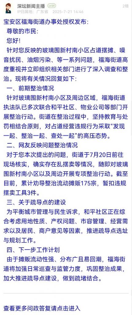 針對您反映的玻璃圍新村南小區(qū)占道擺攤、噪音擾民、油煙污染、等一系列問題,福海街道高度重視并立即組織相關部門進行了深入調查和整治。現將有關情況回復如下:
