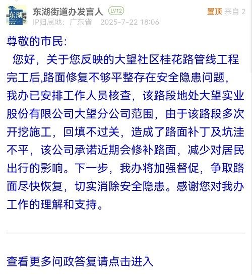 您好,關于您反映的大望社區(qū)桂花路管線工程完工后,路面修復不夠平整存在安全隱患問題,我辦已安排工作人員核查,該路段地處大望實業(yè)股份有限公司大望分公司范圍,由于該路段多次開挖施工,回填不過關,造成了路面補丁及坑洼不平,該公司承諾近期會修補路面,減少對居民出行的影響。下一步,我辦將加強督促,爭取路面盡快恢復,切實消除安全隱患。感謝您對我辦工作的理解和支持。