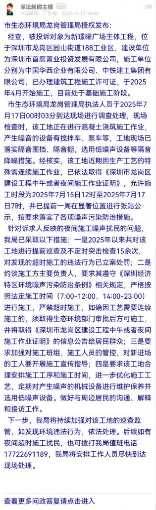 針對訴求人反映的夜間施工噪聲擾民的問題,我局已采取以下措施:一是2025年以來共對該工地進行提前巡查及不定時突擊檢查15余次,對發(fā)現的超時施工的違法行為已立案處罰;二是約談施工方主要負責人,要求其遵守《深圳經濟特區(qū)環(huán)境噪聲污染防治條例》相關規(guī)定,嚴格按照法定施工時間(7:00-12:00、14:00-23:00)進行施工,嚴禁超時施工,如確因工藝需要連續(xù)施工的,須取得生態(tài)環(huán)境部門審批后方可施工,并將取得《深圳市龍崗區(qū)建設工程中午或者夜間施工作業(yè)證明》的信息公告給居民群眾;三是要求加強對施工班組、施工人員的管控,對新進場的工人要開展施工宣傳指導;四是要求該工地合理安排施工工序和施工時間,進一步優(yōu)化施工工藝,定期對產生噪聲的機械設備進行維護保養(yǎng)并選用低噪聲設備。做好與周邊居民的溝通、解釋和接訪工作。