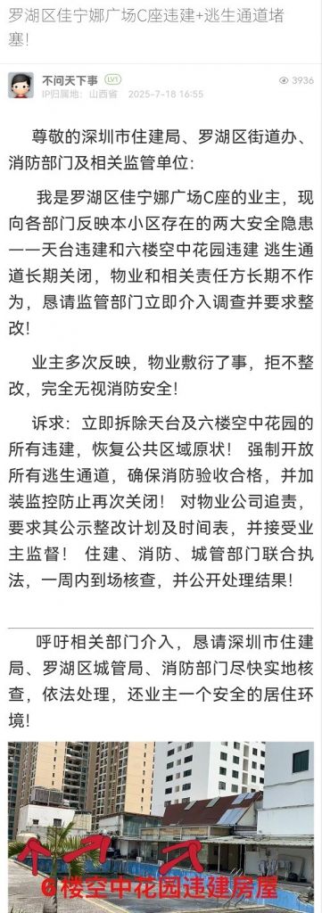 34. 帖文《羅湖區(qū)佳寧娜廣場C座違建+逃生通道堵塞!》