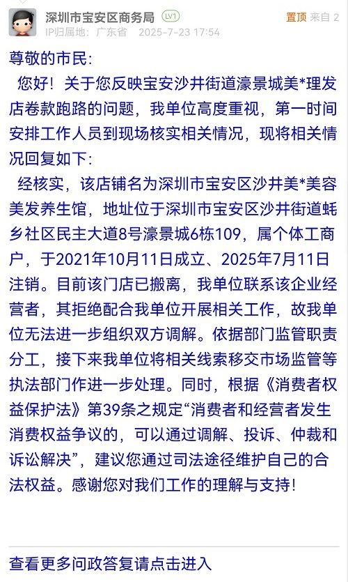 經核實,該店鋪名為深圳市寶安區(qū)沙井美*美容美發(fā)養(yǎng)生館,地址位于深圳市寶安區(qū)沙井街道蠔鄉(xiāng)社區(qū)民主大道8號濠景城6棟109,屬個體工商戶,于2021年10月11日成立、2025年7月11日注銷。目前該門店已搬離,我單位聯(lián)系該企業(yè)經營者,其拒絕配合我單位開展相關工作,故我單位無法進一步組織雙方調解。依據部門監(jiān)管職責分工,接下來我單位將相關線索移交市場監(jiān)管等執(zhí)法部門作進一步處理。同時,根據《消費者權益保護法》第39條之規(guī)定“消費者和經營者發(fā)生消費權益爭議的,可以通過調解、投訴、仲裁和訴訟解決”,建議您通過司法途徑維護自己的合法權益。感謝您對我們工作的理解與支持!