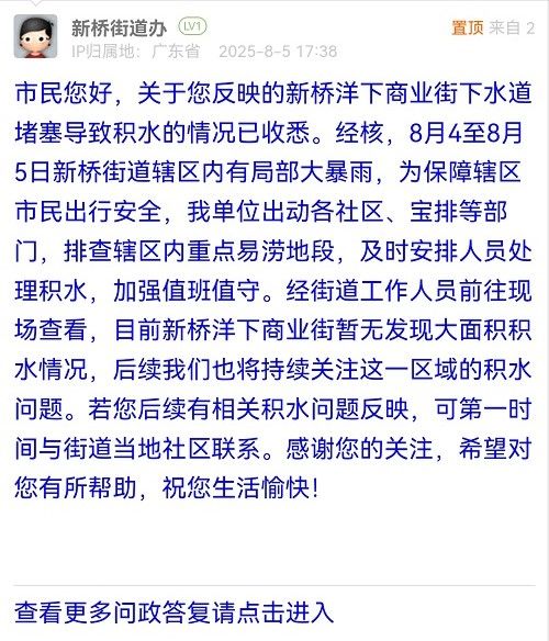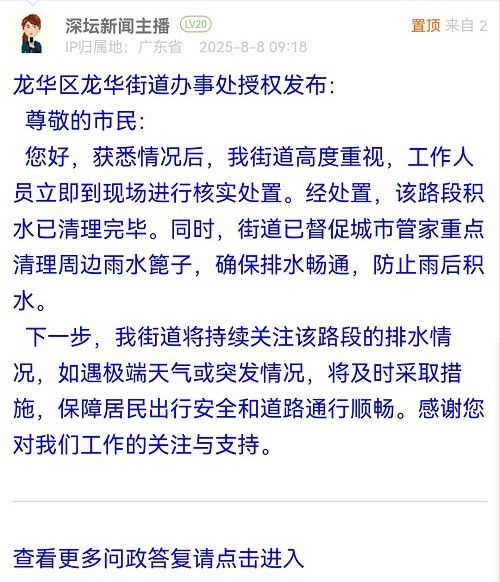 您好,獲悉情況后,我街道高度重視,工作人員立即到現(xiàn)場進(jìn)行核實處置。經(jīng)處置,該路段積水已清理完畢。同時,街道已督促城市管家重點清理周邊雨水篦子,確保排水暢通,防止雨后積水。