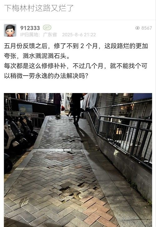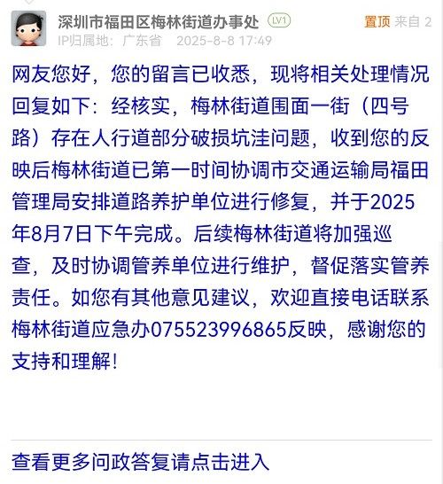 網(wǎng)友您好,您的留言已收悉,現(xiàn)將相關(guān)處理情況回復(fù)如下:經(jīng)核實,梅林街道圍面一街(四號路)存在人行道部分破損坑洼問題,收到您的反映后梅林街道已第一時間協(xié)調(diào)市交通運輸局福田管理局安排道路養(yǎng)護(hù)單位進(jìn)行修復(fù),并于2025年8月7日下午完成。后續(xù)梅林街道將加強巡查,及時協(xié)調(diào)管養(yǎng)單位進(jìn)行維護(hù),督促落實管養(yǎng)責(zé)任。如您有其他意見建議,歡迎直接電話聯(lián)系梅林街道應(yīng)急辦075523996865反映,感謝您的支持和理解!