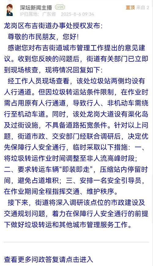 經(jīng)工作人員現(xiàn)場查看,該處垃圾站兩側(cè)均設(shè)有人行通道。但因垃圾轉(zhuǎn)運站條件限制,在作業(yè)時需占用原有人行通道,導(dǎo)致行人、非機動車需繞行至機動車道。同時,該處龍崗大道設(shè)有渠化島及過街設(shè)施,不具備道路拓寬條件。針對以上問題,街道市政、交安部門經(jīng)聯(lián)合調(diào)研后,決定優(yōu)先保障行人安全通行,臨時采取以下措施:一、將垃圾轉(zhuǎn)運作業(yè)時間調(diào)整至非人流高峰時段;二、要求轉(zhuǎn)運車輛“即裝即走”,壓縮站內(nèi)停留時間,避免占道堆積;三、安排一名安全引導(dǎo)員,在作業(yè)期間全程指揮交通、維護(hù)秩序。