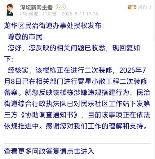 經(jīng)核實,該樓棟正在進(jìn)行二次裝修,2025年7月8日已在相關(guān)部門進(jìn)行零星小散工程二次裝修備案。就您反映該樓棟涉嫌違規(guī)搭建行為,民治街道綜合行政執(zhí)法隊已對民樂社區(qū)工作站下發(fā)第三方《協(xié)助調(diào)查通知書》,目前該事項正在依法依規(guī)推進(jìn)中。感謝您對我們工作的理解和支持。
