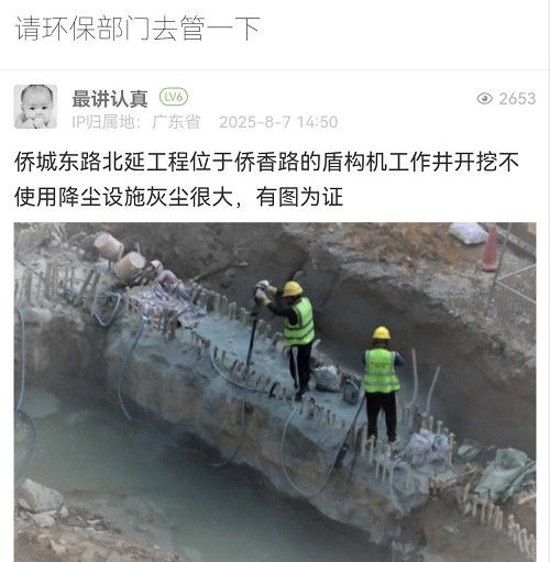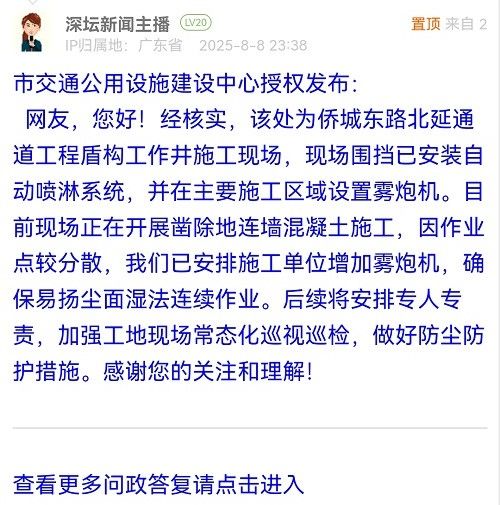 網(wǎng)友,您好!經(jīng)核實,該處為僑城東路北延通道工程盾構(gòu)工作井施工現(xiàn)場,現(xiàn)場圍擋已安裝自動噴淋系統(tǒng),并在主要施工區(qū)域設(shè)置霧炮機。目前現(xiàn)場正在開展鑿除地連墻混凝土施工,因作業(yè)點較分散,我們已安排施工單位增加霧炮機,確保易揚塵面濕法連續(xù)作業(yè)。后續(xù)將安排專人專責(zé),加強工地現(xiàn)場常態(tài)化巡視巡檢,做好防塵防護(hù)措施。感謝您的關(guān)注和理解!