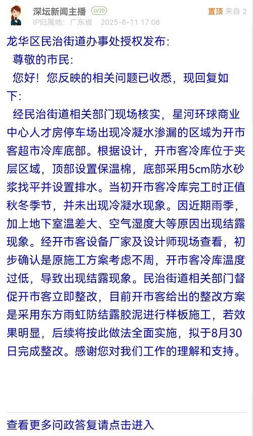 經(jīng)民治街道相關(guān)部門現(xiàn)場核實,星河環(huán)球商業(yè)中心人才房停車場出現(xiàn)冷凝水滲漏的區(qū)域為開市客超市冷庫底部。根據(jù)設(shè)計,開市客冷庫位于夾層區(qū)域,頂部設(shè)置保溫棉,底部采用5cm防水砂漿找平并設(shè)置排水。當(dāng)初開市客冷庫完工時正值秋冬季節(jié),并未出現(xiàn)冷凝水現(xiàn)象。因近期雨季,加上地下室溫差大、空氣濕度大等原因出現(xiàn)結(jié)露現(xiàn)象。經(jīng)開市客設(shè)備廠家及設(shè)計師現(xiàn)場查看,初步確認(rèn)是原施工方案考慮不周,開市客冷庫溫度過低,導(dǎo)致出現(xiàn)結(jié)露現(xiàn)象。民治街道相關(guān)部門督促開市客立即整改,目前開市客給出的整改方案是采用東方雨虹防結(jié)露膠泥進(jìn)行樣板施工,若效果明顯,后續(xù)將按此做法全面實施,擬于8月30日完成整改。感謝您對我們工作的理解和支持。