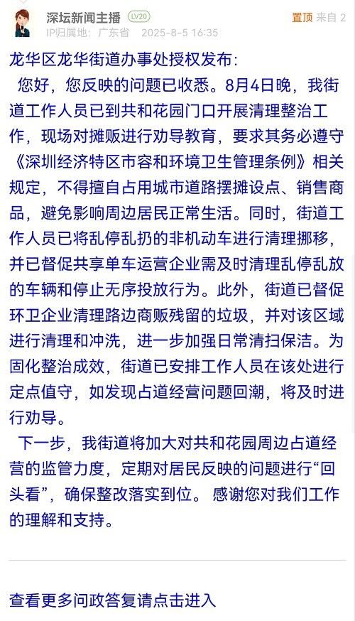 您好,您反映的問題已收悉。8月4日晚,我街道工作人員已到共和花園門口開展清理整治工作,現(xiàn)場對攤販進(jìn)行勸導(dǎo)教育,要求其務(wù)必遵守《深圳經(jīng)濟特區(qū)市容和環(huán)境衛(wèi)生管理條例》相關(guān)規(guī)定,不得擅自占用城市道路擺攤設(shè)點、銷售商品,避免影響周邊居民正常生活。同時,街道工作人員已將亂停亂扔的非機動車進(jìn)行清理挪移,并已督促共享單車運營企業(yè)需及時清理亂停亂放的車輛和停止無序投放行為。此外,街道已督促環(huán)衛(wèi)企業(yè)清理路邊商販殘留的垃圾,并對該區(qū)域進(jìn)行清理和沖洗,進(jìn)一步加強日常清掃保潔。為固化整治成效,街道已安排工作人員在該處進(jìn)行定點值守,如發(fā)現(xiàn)占道經(jīng)營問題回潮,將及時進(jìn)行勸導(dǎo)。