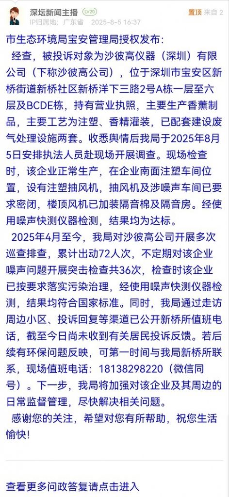 經(jīng)查,被投訴對象為沙彼高儀器(深圳)有限公司(下稱沙彼高公司),位于深圳市寶安區(qū)新橋街道新橋社區(qū)新橋洋下三路2號A棟一層至六層及BCDE棟,持有營業(yè)執(zhí)照,主要生產(chǎn)香薰制品,主要工藝為注塑、香精灌裝,已配套建設(shè)廢氣處理設(shè)施兩套。收悉輿情后我局于2025年8月5日安排執(zhí)法人員赴現(xiàn)場開展調(diào)查?,F(xiàn)場檢查時,該企業(yè)正常生產(chǎn),在企業(yè)南面注塑車間位置,設(shè)有注塑抽風(fēng)機,抽風(fēng)機及涉噪聲車間已要求密閉,樓頂風(fēng)機已加裝隔音棉及隔音房。經(jīng)使用噪聲快測儀器檢測,結(jié)果均為達(dá)標(biāo)。